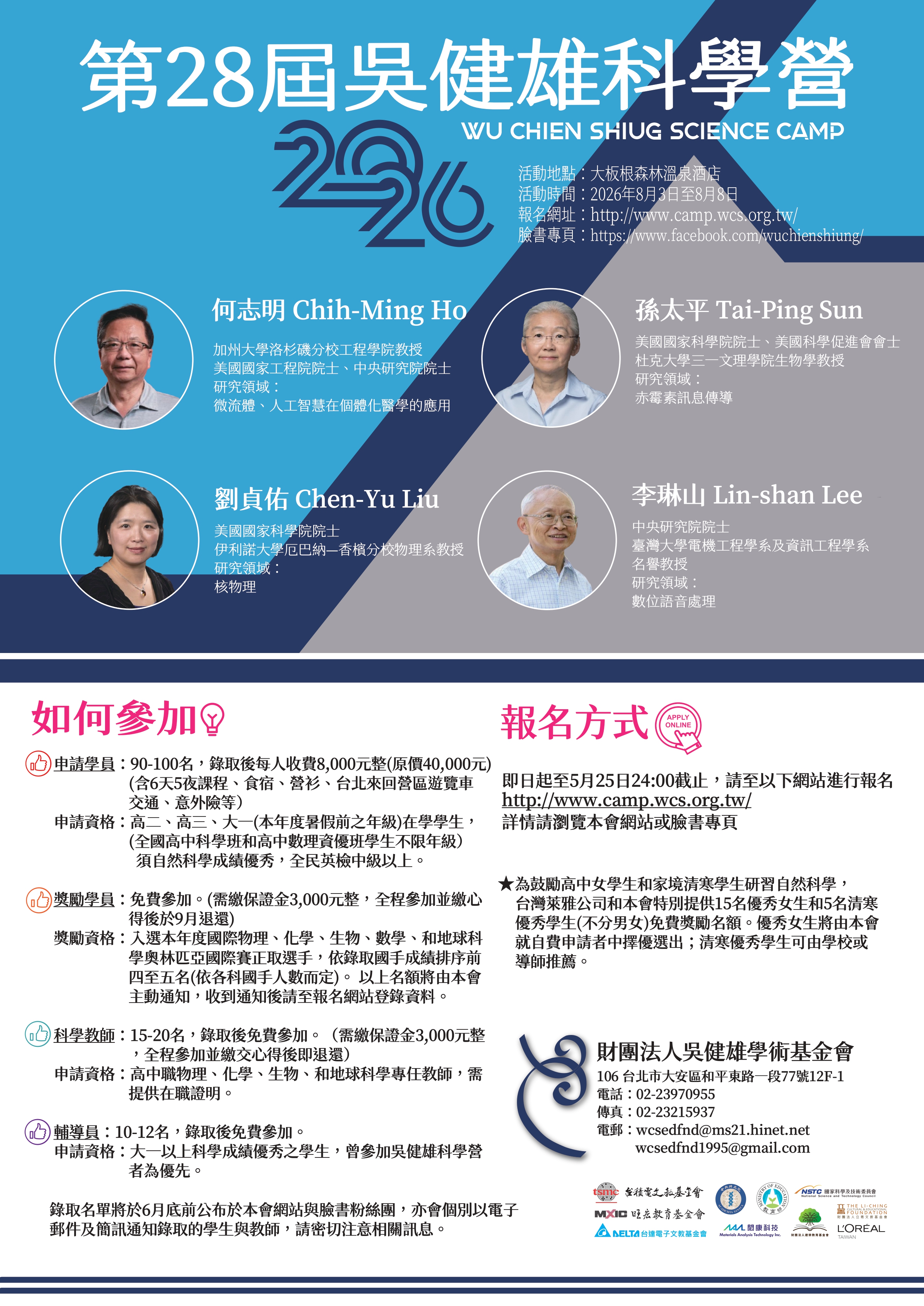 報名資格:大一以上自然科學成績優秀、英文程度良好之學生,曾參加過吳健雄科學營者更佳。